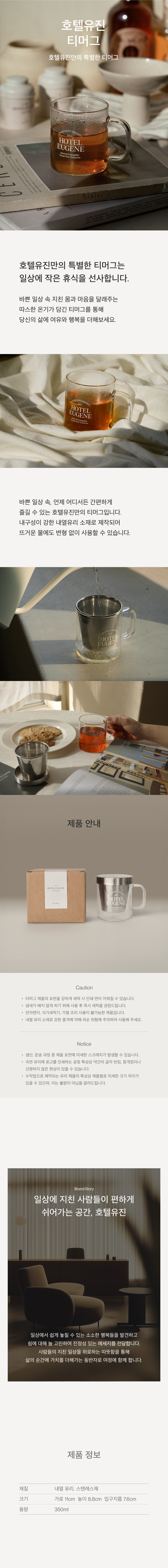 바쁜 일상 속, 언제 어디서든 간편하게 즐길 수 있는 호텔유진만의 티머그입니다. 지친 몸과 마음을 달래주는 따스한 온기가 담긴 티머그를 통해 당신의 삶에 여유와 행복을 더해보세요.
